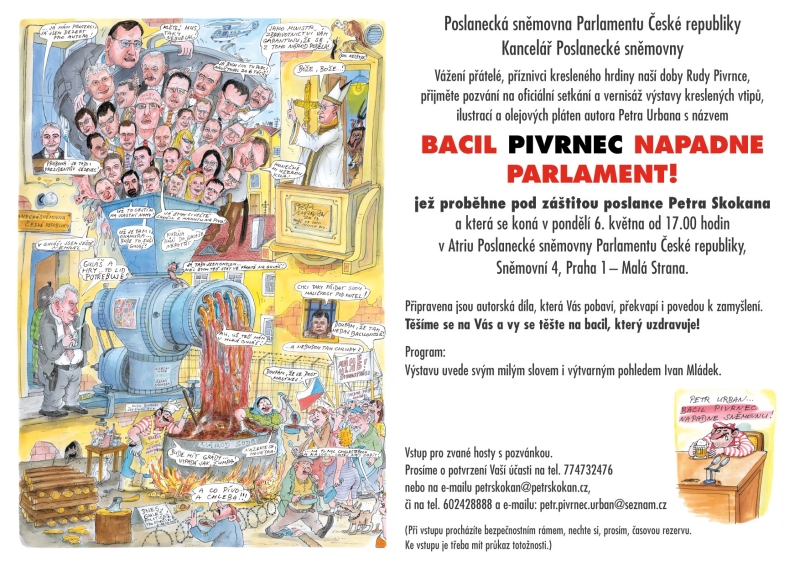 V tu dobu totiž začne v atriu Poslanecké sněmovny Parlamentu České republiky ve Sněmovní 4 v Praze na Malé Straně vernisáž výstavy kreslených vtipů, ilustrací a olejových pláten kreslíře, malíře a humoristy Petra Urbana s názvem „Bacil Pivrnec napadne parlament“.