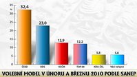 Volby do Sněmovny by na přelomu února a března vyhrála ČSSD s 32,4 procenta. ODS na druhém místě by získala 23 procent hlasů. Ve Sněmovně by zasedli i zástupci TOP 09, komunistů, lidovců a také Věcí veřejných. Vyplývá to z průzkumu agentury Sanep.